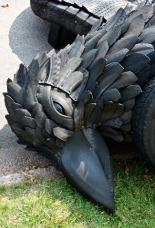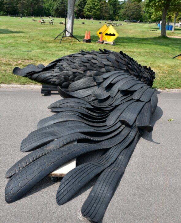 When the Rubber Meets the Road, 2018 by PEI artist Gerald Beaulieu are two crows made entirely from recycled tires, each measuring 16 feet long, it’s placed along the multi-use pathway on LeBreton Flats in Ottawa. According to the National Capital Commission “the harm caused by our commuter culture as well as the crow’s role as a scavenger of urban waste “ – LeBreton Flats used to be the site of a landfill, making the recycled content especially significant.
