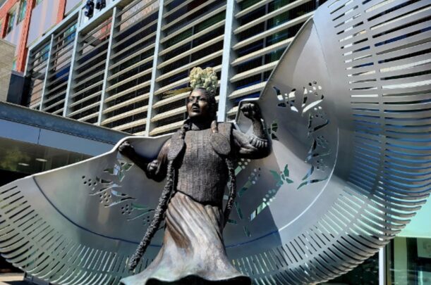 Lionel Peyachew’s life-sized bronze sculpture titled “Wicanhi Duta Win (Red Star Woman)” sits outside the headquarters of the Saskatoon Police Services building. It is a powerful symbol of remembrance for missing and murdered Indigenous women and girls. It depicts a woman dancing on a cloud, her shawl transforming into eagle’s wings as it trails behind her. The piece