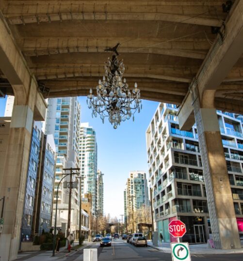 The Spinning Chandelier designed by the late BC born artist Rodney Graham sits under the Granville Street Bridge at the entrance to Downtown Vancouver, Granville Island, and False