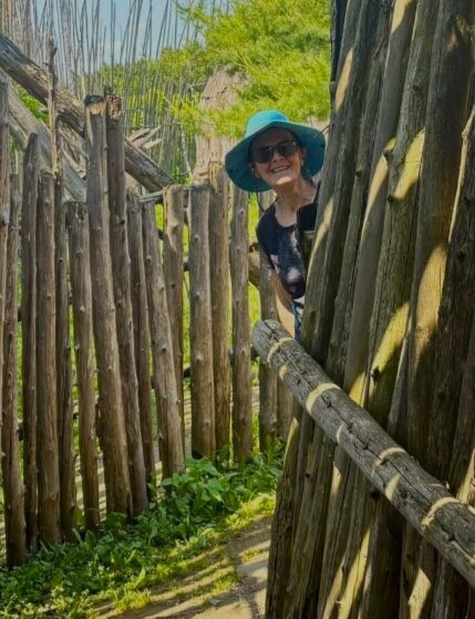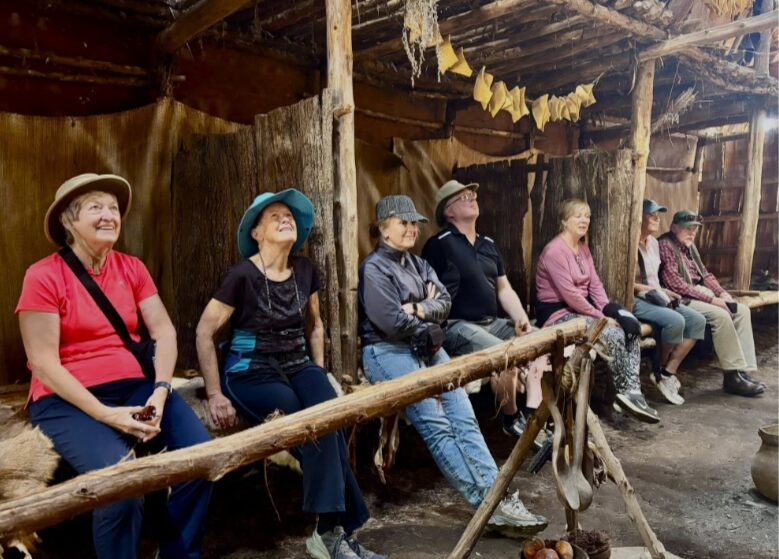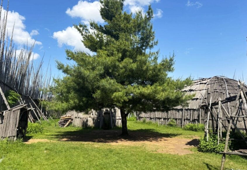 We exit the village back through the twisting, narrow passage to view a representation of an archaeological site. A large tarp laid out in a field represents a dig where a longhouse would have been located. Painted red triangles mark where fires would have been lit. The number of pits would reveal the length of the longhouse and provide an estimate of the number of people who resided there. On the actual site, a shorter distance away near a stand of trees, more than 150,000 artifacts were found, enough to determine that this village would have had fifteen longhouses, roughly translating to a population of 750 people. A collection of these artifacts can be viewed in the museum located in the village.