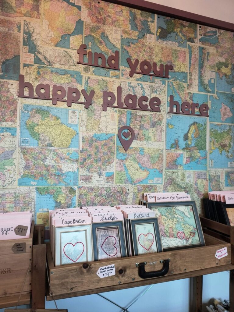 As always there was plenty of time for networking, circle time for introductions and time to check out the location, Sadie and June which specializes in Vintage Map Gifts and items from local makers. There is a lot to see but everything is well organized and visible but I do need to let you know that you will to visit on a day when you have time as you will want to check out everything – there are so many unique gift ideas here. The Vintage Maps with red hears embroidered by Steve (as we found out at our gathering) can be purchased as gifts for so many different occasions and all the T-shirts and hats are designed by this talented duo.