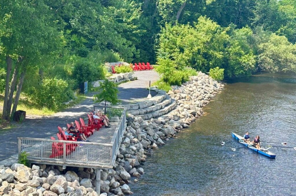 After securing our bicycles, we walk down to the pedestrian bridge leading to the River House. To our right we can glimpse the large river-pool surrounded by scenic views of sailboats and yachts. The setting is spectacular! To our left we can see several moored sailboats and kayaks for rent. Facing them is a patio with a row of empty red Muskoka chairs. It looks like an ideal spot to have lunch. We zig-zag down the accessible walkway to reach the patio to our front row seats. From this vantage point, we can enjoy the action on the water. A children’s sailing lesson is in progress, and they seem to be having a great time. You can’t beat a picnic with a view.