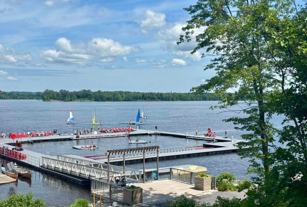 With merely a dozen kilometers one way, it doesn’t take us long to reach our destination. For our convenience, numerous bike racks grace the NCC River House property creating a cyclist-friendly atmosphere. The century-old building is even more impressive in person. Designated as a heritage building, it was originally built for a competitive canoeing club, and evolved over the years to include sailing, rowing, and tennis. Its construction, started in 1914, was halted because of World War I, and took nine years to complete. With time, the building fell into disrepair and was eventually closed for extensive renovations. When it re-opened in 2023 it boasted an enclosed swimming area for the public free of cost.