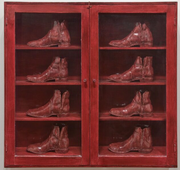 Gathie Falk, Eight Red Boots, 1973, red glazed ceramic in painted plywood and glass cabinet, photo courtesy of National Gallery of Canada, courtesy of the artist