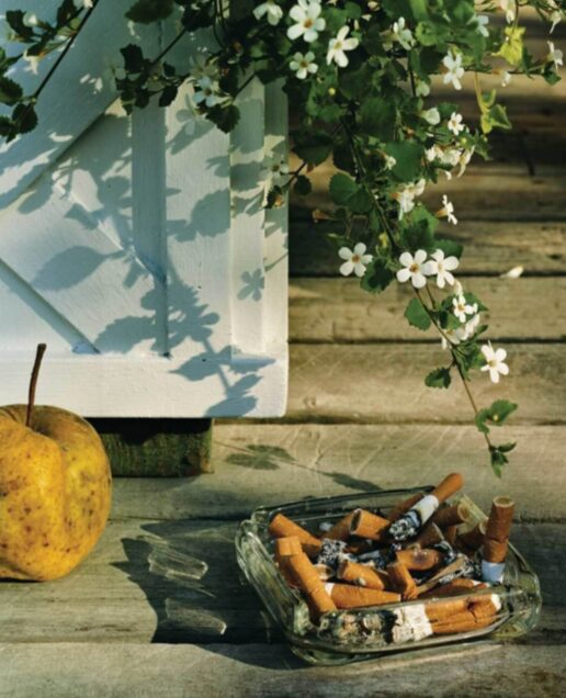 In his photographic image the artist Roe Etheridge portrays the contemporary with the notions of the historic – an emphasis on earthly pleasures cigarettes and an apple that both could be symbolic of death. The flowers also add flavour to the theme of life and death. When photographing this still life the artist chose a full ashtray, along with how the objects would appear.