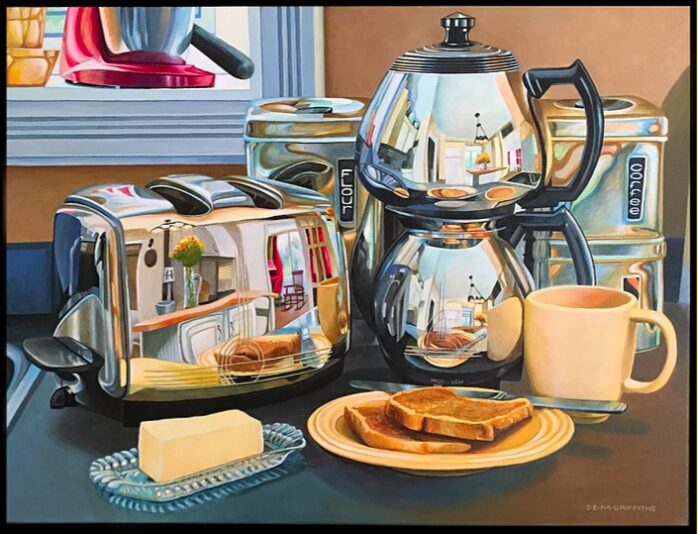 In Ian Griffiths brilliantly reflective work the combination of skill and narrative can be clearly seen. Griffiths continues the Dutch tradition of hyper-realism that both showcases his skill as a fine artist as well as his nostalgia for objects that pertain to the middle of the 20th century. His work along with the work of Susie Fairbrother can be seen at the Cline House Gallery, Cornwall, from September 18th to October 25th.