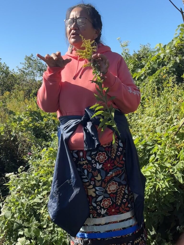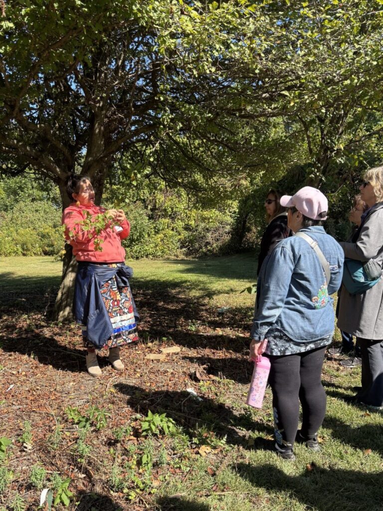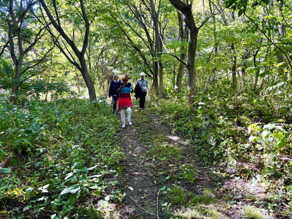 Our group gathered at the firepit where we were introduced to Alicia Cook, Medicine Woman, Healer, Teacher, former Nurse, and member of the Wolf Clan. She spoke of her culture’s gratitude rather than prayer for everything that nature provides for us. The plants give us nutrition and medicine. Animals and insects all have their roles to play and they are all important. The sun, the moon, even thunder and lighting are all here for a reason. She then sang the Mohawk Water Song which gives tribute to the sacredness of the water. We would do the Medicine Walk counterclockwise, she explained, like the cycle of life (which mimics the rotation of the sun around the earth).