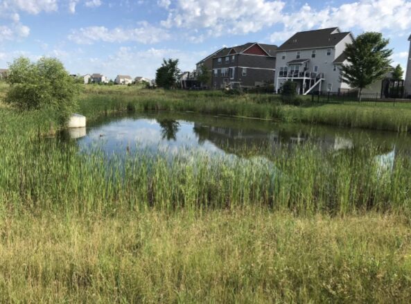 Stormwater retention ponds help to control flooding nd add biodiversity. Cornwall ncorporates them into many new developments.