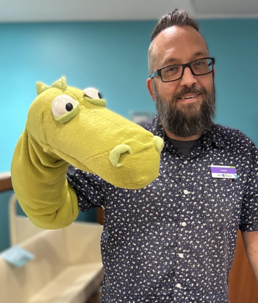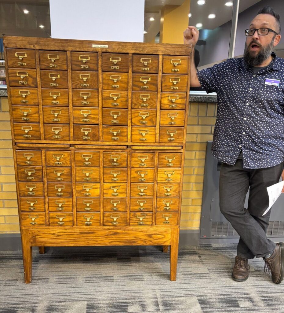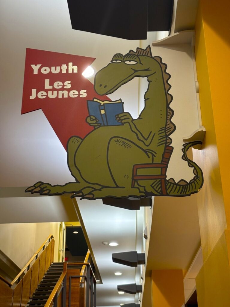Among many other interesting stories about the library, Frank told us about Simon, the dragon puppet, an actual puppet made by Frank himself over 20 years ago. The puppet was inspired by signage at the bottom of the stairs leading to the children’s department on the upper level. It was part of a production show called “Simon’s Moving Picture Show.”