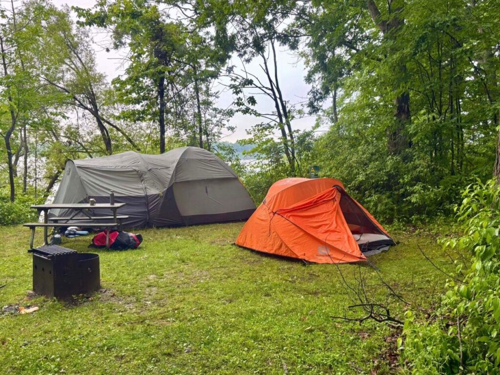 We land on the island on the small beach in between the motorboat docks and unload, lugging all our belongings to our site. We will find out later that there is a wagon available to campers to make this task easier. The sites are in clusters and the only one near ours is vacant. For a change, the boys get the bigger tent, the one I nicknamed “the castle,” because there are three of them to our two. It is a rare occurrence for the males to outnumber the females on our excursions. To our delight, there is an enclosed recreation building just a stone’s throw away from our site, with a large box for storing food. It will keep our food away from curious raccoons and give us shelter should it rain. We pick up some firewood which is purchased on an honor-system by putting money in a slotted lockbox. We are ready!
