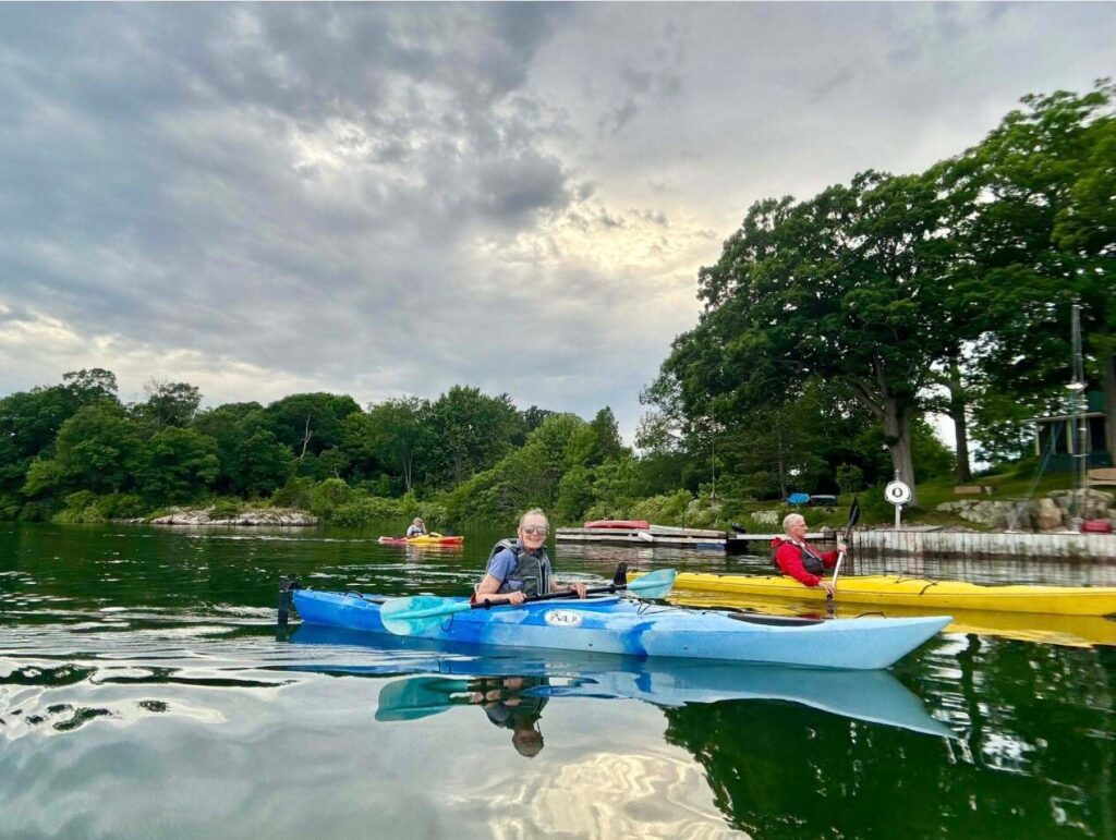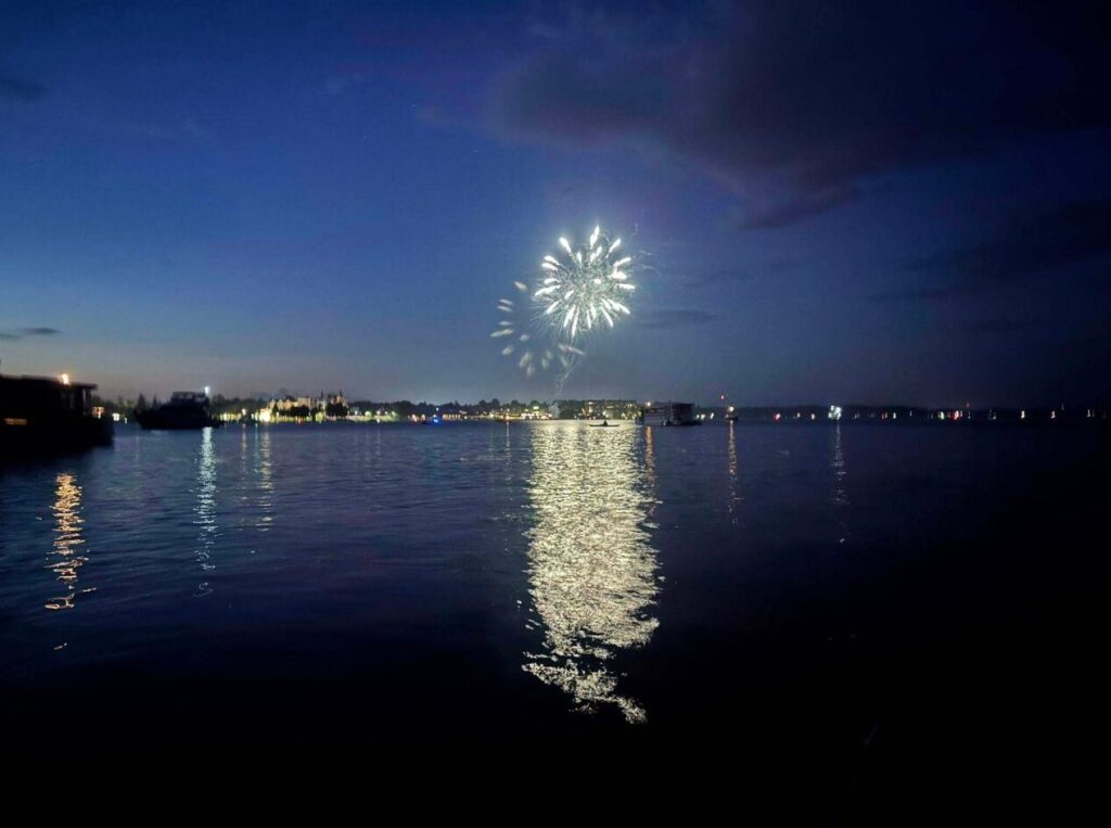 A sunset paddle to watch Gananoque’s fireworks proves to be a little bit more than we bargained for. Restless, we decide to leave early to hang out on the river. We slither amongst the yachts that have chosen to anchor here for the night to view the light show. The sunset is magnificent from this vantage point, but we are not prepared for the swarm of mosquitoes. With the fireworks delayed, we spend forty- five minutes slapping at the voracious pests and voicing the occasional “ouch!” Finally, the first firework explodes, soon followed by a collective cheer. The colourful bursts reflected on the water’s surface are dazzling, and before long, the mosquitoes are all but forgotten. As the last of the smoke dissipates in the air, we turn on our lights to retreat to our camp. To our dismay we immediately realize that the mosquitoes have been replaced by thick clouds of shadflies. Attracted by our headlights, they dart at our faces. We paddle frantically, but try-as-we-might, we cannot divert head-on collisions with these flying beasts. Blinking our eyes and spitting out unwanted proteins, we race to the imaginary finish line. For obvious reasons, no one dares open their mouth to speak. Landing safely and away from the fluttering creatures, someone sums up our hasty evacuation with “That was nasty!” It surely was, but totally worth it in retrospect.