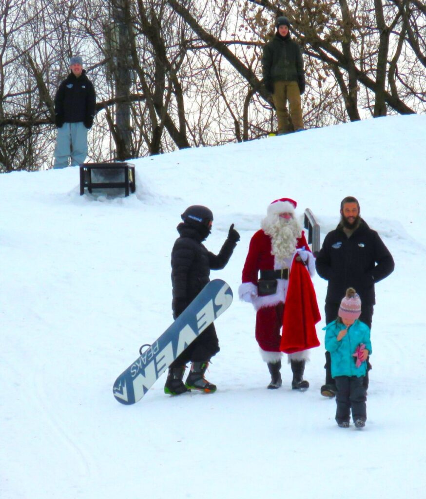 On December 21st, I caught up with Santa Claus on the ski hill. When I arrived at the Big Ben Ski Centre, I spotted him at the top of the hill and watched him make his way down, slipping and sliding. He was carrying his big red bag and would occasionally pause to give out treats to the kids and pose for photos as snowboarders and skiers zipped all around him.