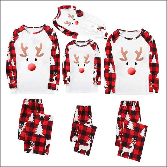 The tops feature adorable reindeer faces printed on soft, comfortable fabric with long sleeves and round necklines. The matching plaid pants add a traditional holiday touch, making the sets visually appealing for Christmas photos, gatherings, and parties. These pajama sets are available in a wide range of sizes, including men, women, kids, and toddlers.