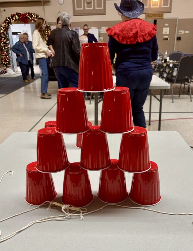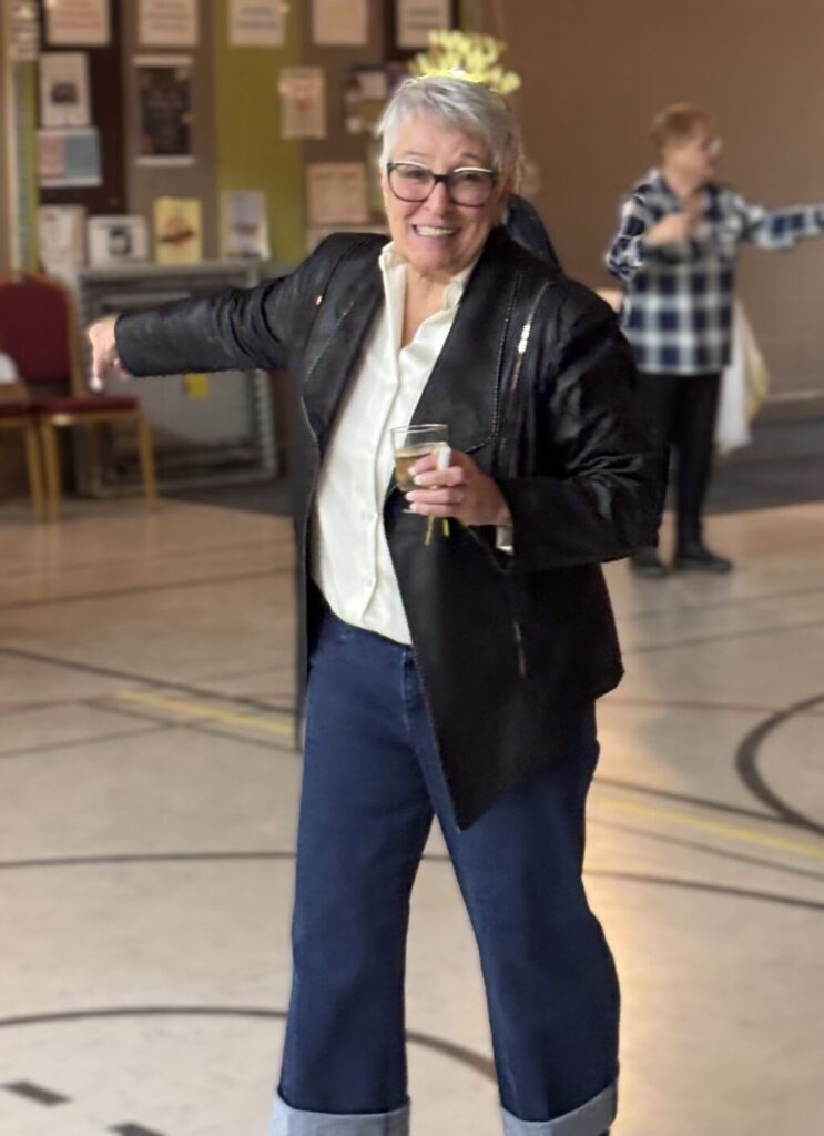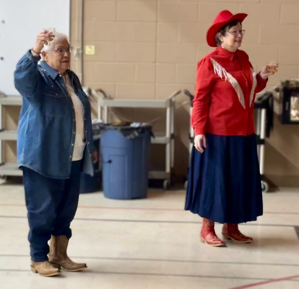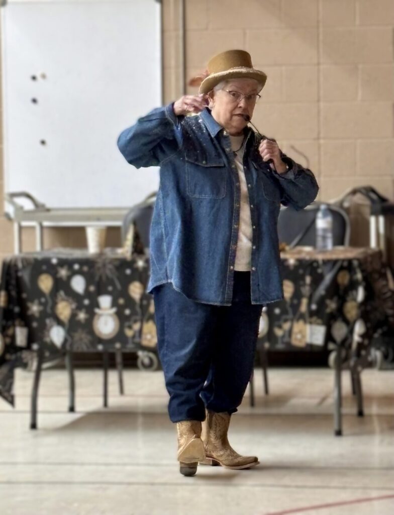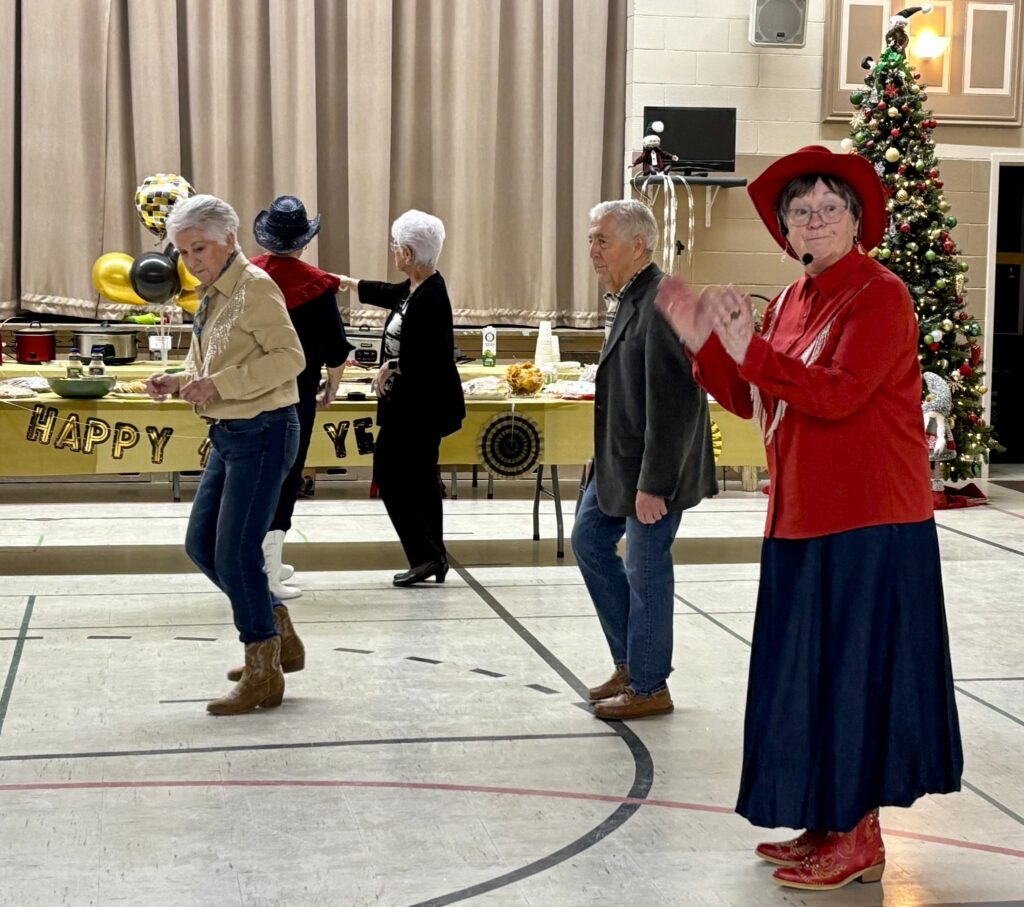 La soirée à thème western s’est poursuivie avec un souper communautaire composé de délicieuses salades, amuse-gueules, plats réconfortants chauds, et desserts, suivi de quelques « chansons à répondre » pour entrer dans l’esprit festif. Les festivités ont continué avec de la danse sociale et en ligne animée par Claire Lemieux, et entrecoupée de jeux divertissants.
