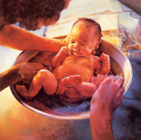 This painting was done by the Canadian artist Mary Pratt, widely known for her hyper realistic oil paintings. The image depicts her first grandchild by her elder daughter Anne. The two adults bathing the child are Mary herself and Anne. In interviews over the years, Pratt stated that the artwork, Mary Pratt, Child with Two Adults, 1983 Oil on Masonite, Private collection, is one of her favourites.