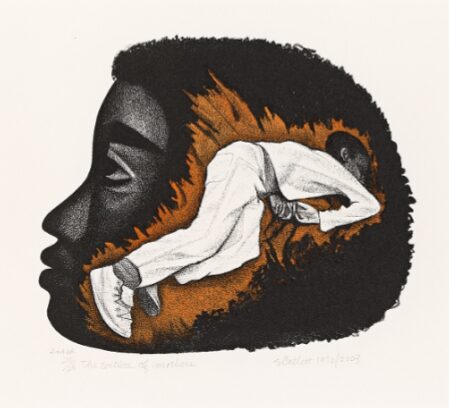 Black motherhood is a recurring subject in Elizabeth Catlett’s work. Using printmaking and sculpture, she depicted this theme from various aesthetic and philosophical perspectives. “Black women have been cast in the role of carrying on the survival of Black people through their position as mothers and wives, protecting and educating and stimulating children and Black men,” Catlett said.